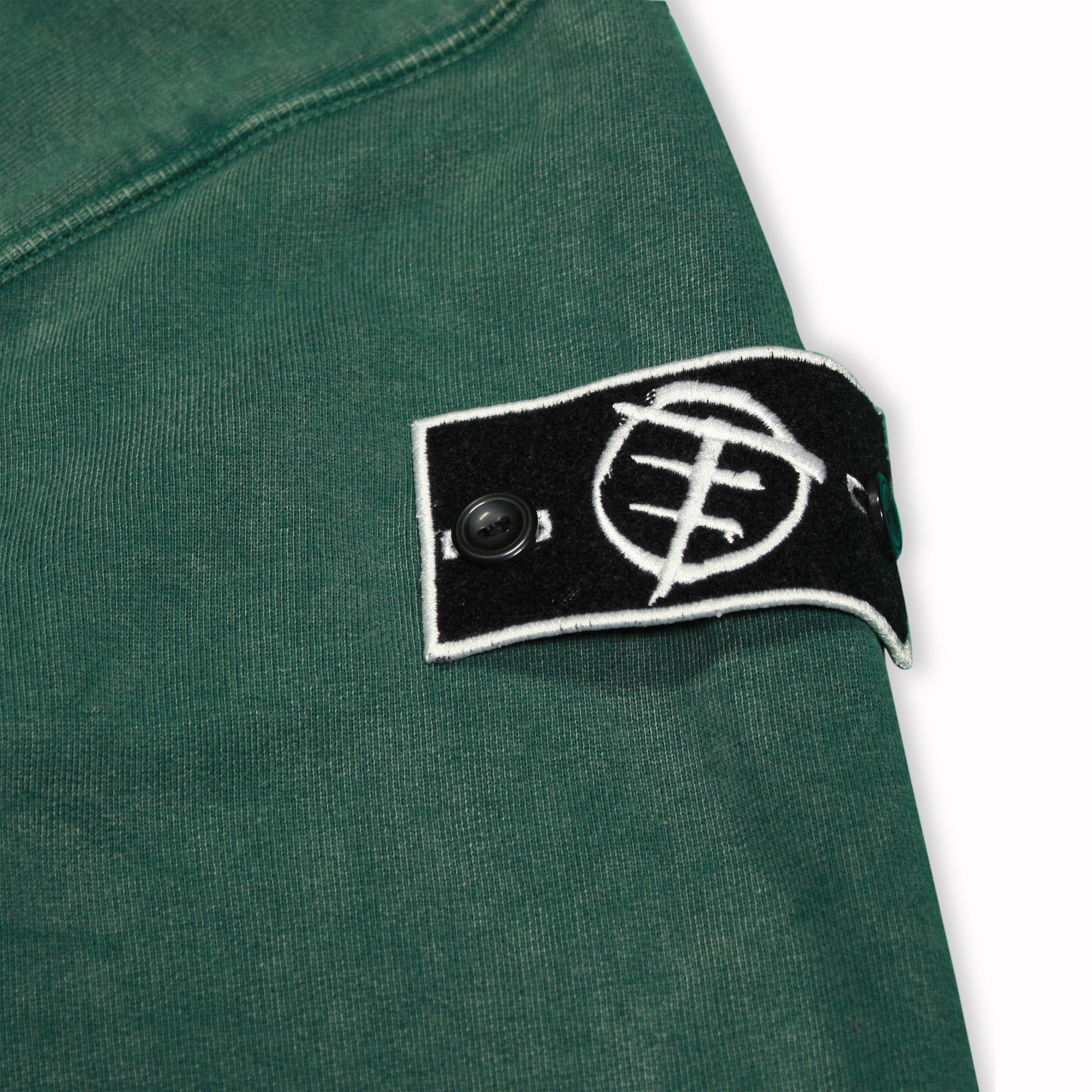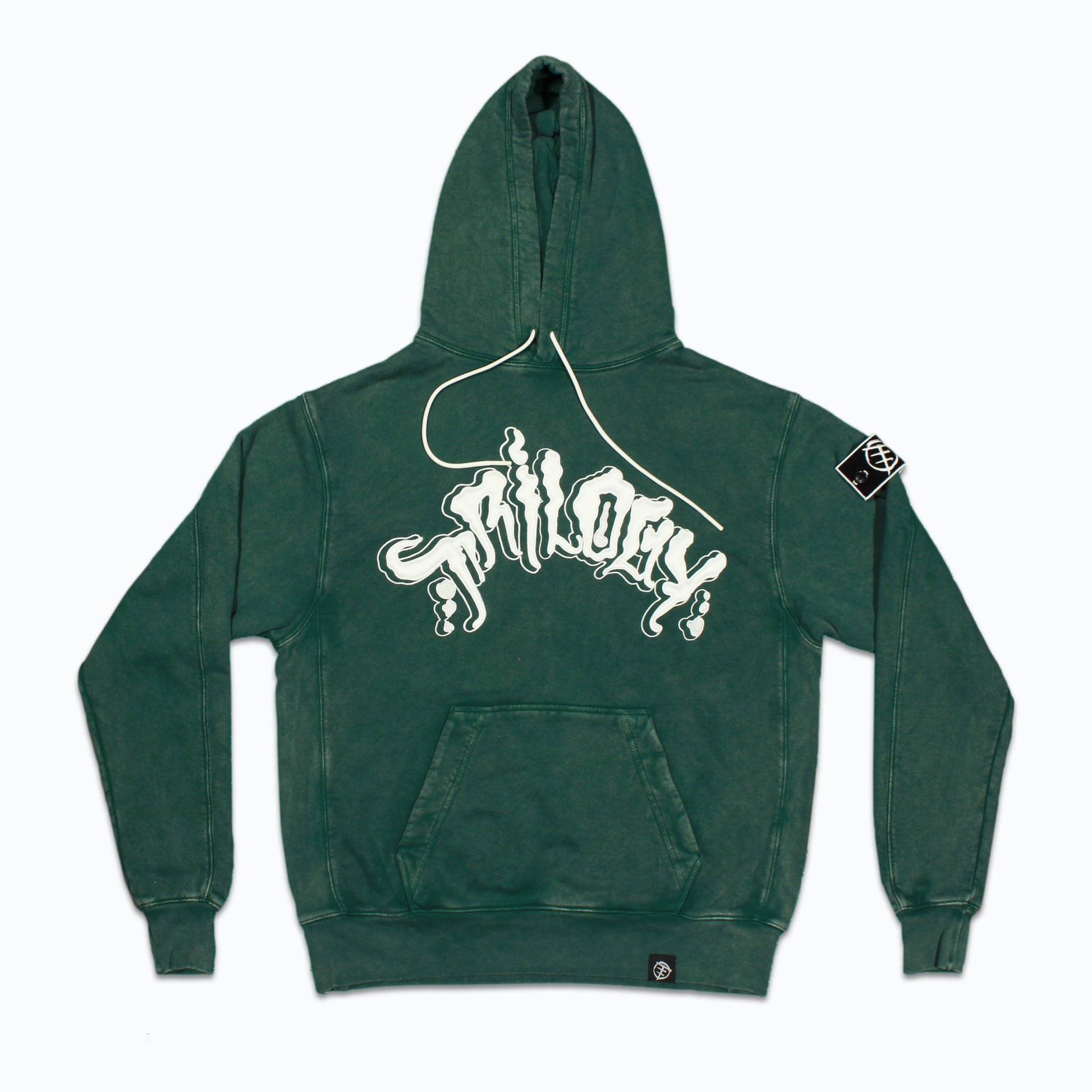 Cut and sew Brick Peninsula hoodies made up on bamboo cotton & cotton fleece. Hoodies have been stone washed to give the green color. Trilogy patch is on left sleeve. Handmade in Los Angeles