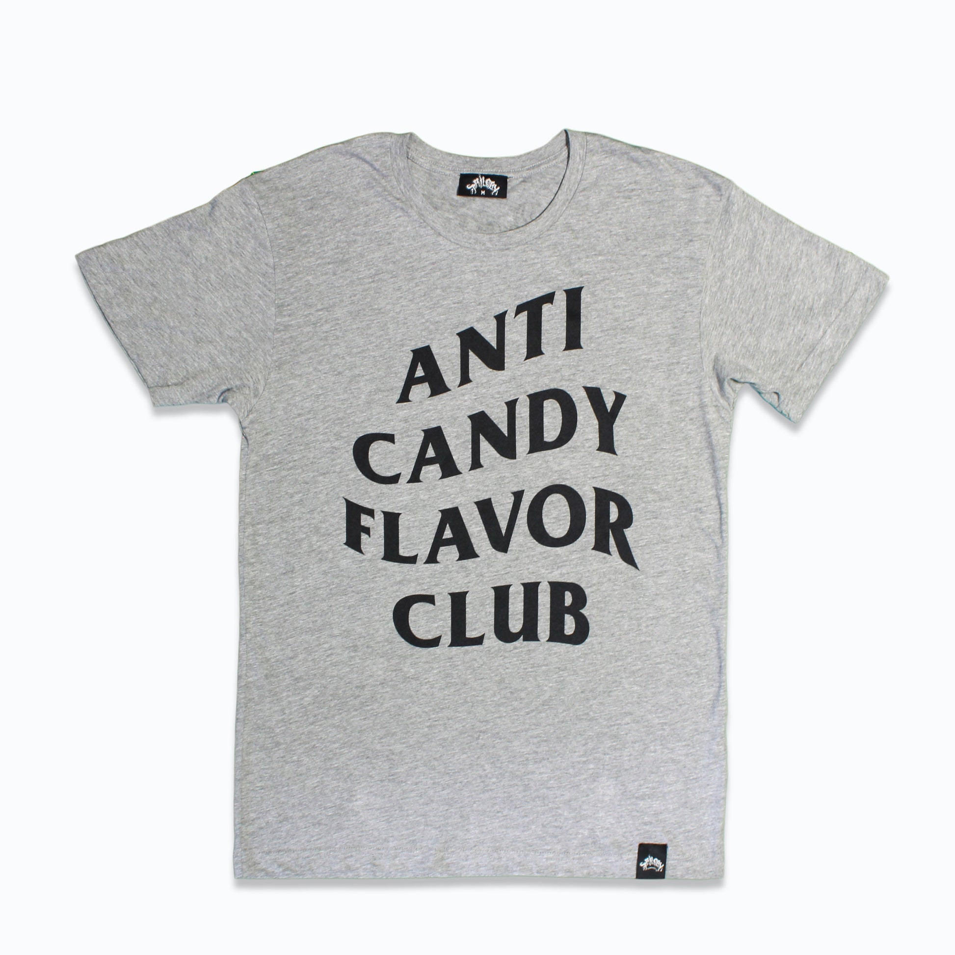 Black Screen printed "Anti Candy Flavor Club" on front of shirt and Trilogy logo on the back of a grey cotton t-shirt.