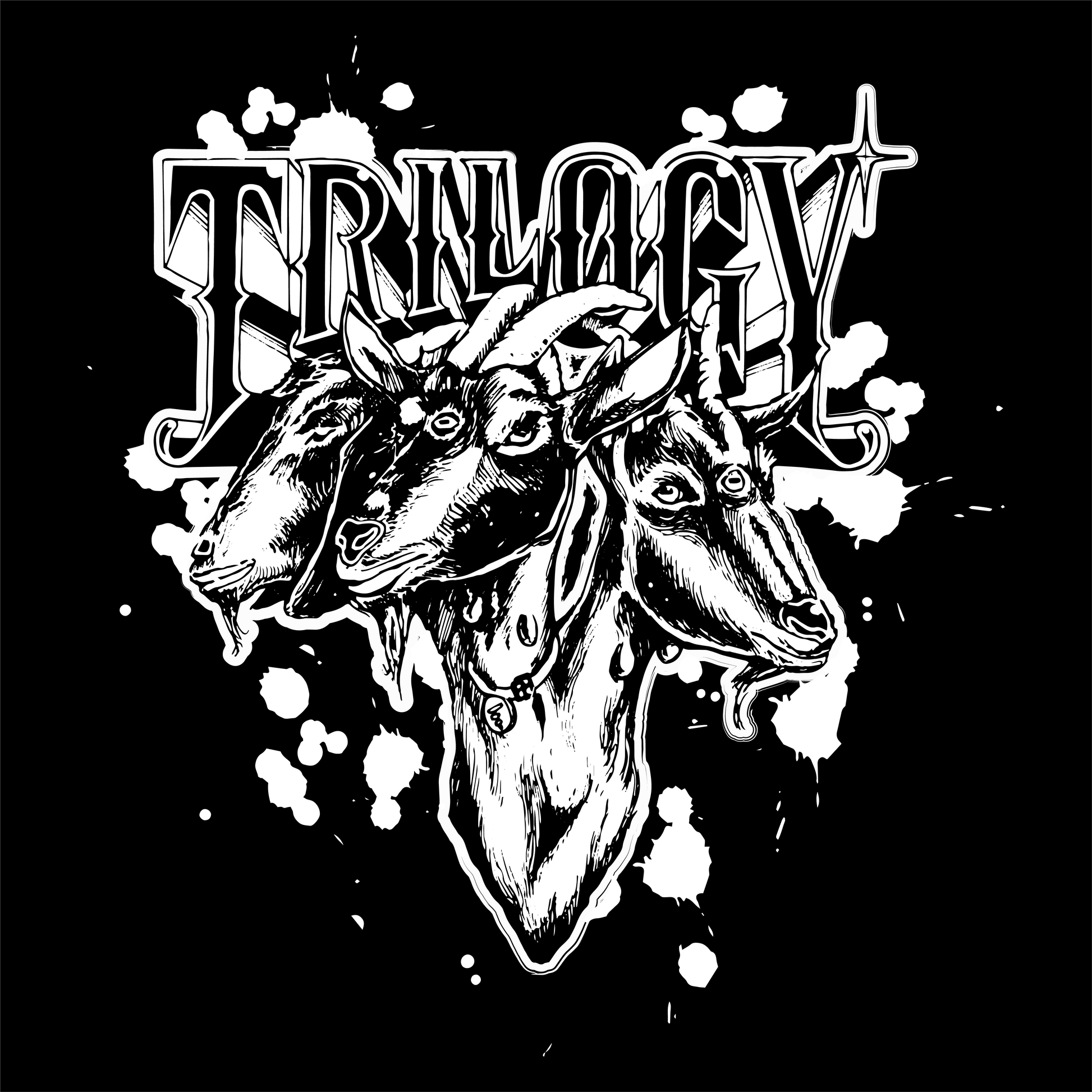White Screen printed Trilogy "GOAT" on black cotton t-shirt. Trilogy brush "T:" on front left chest.